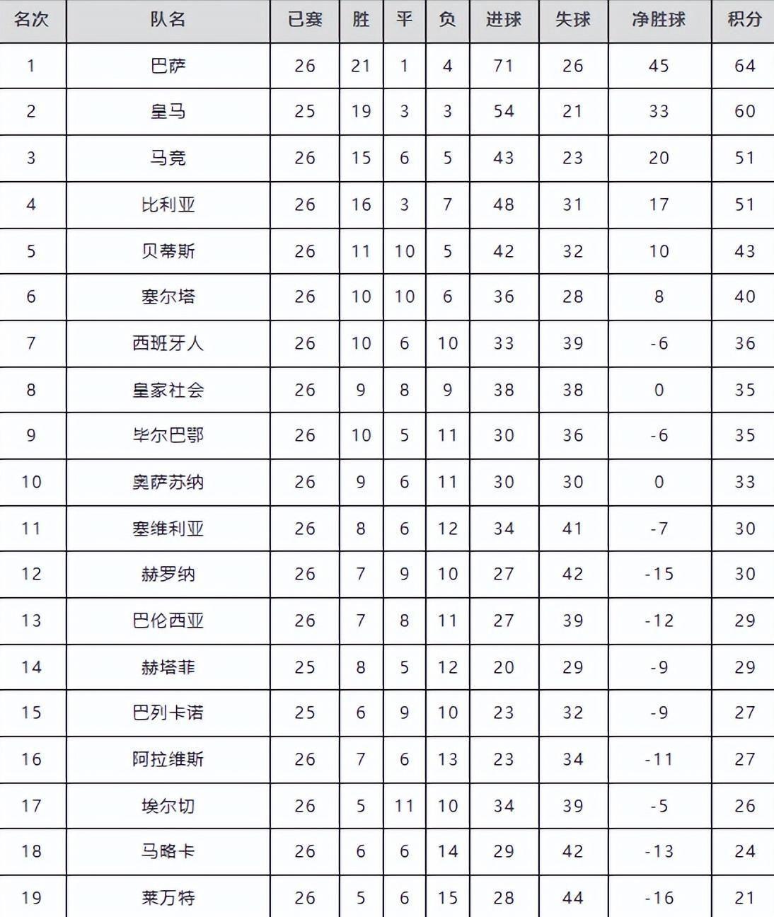 但接连两场关键战役失利,已令其丧失争冠主动权;马竞与比利亚雷亚尔同积51分,分列第三、第四位,距离榜首已有显著分差,基本退出冠军争夺,转而聚焦欧冠资格名额;